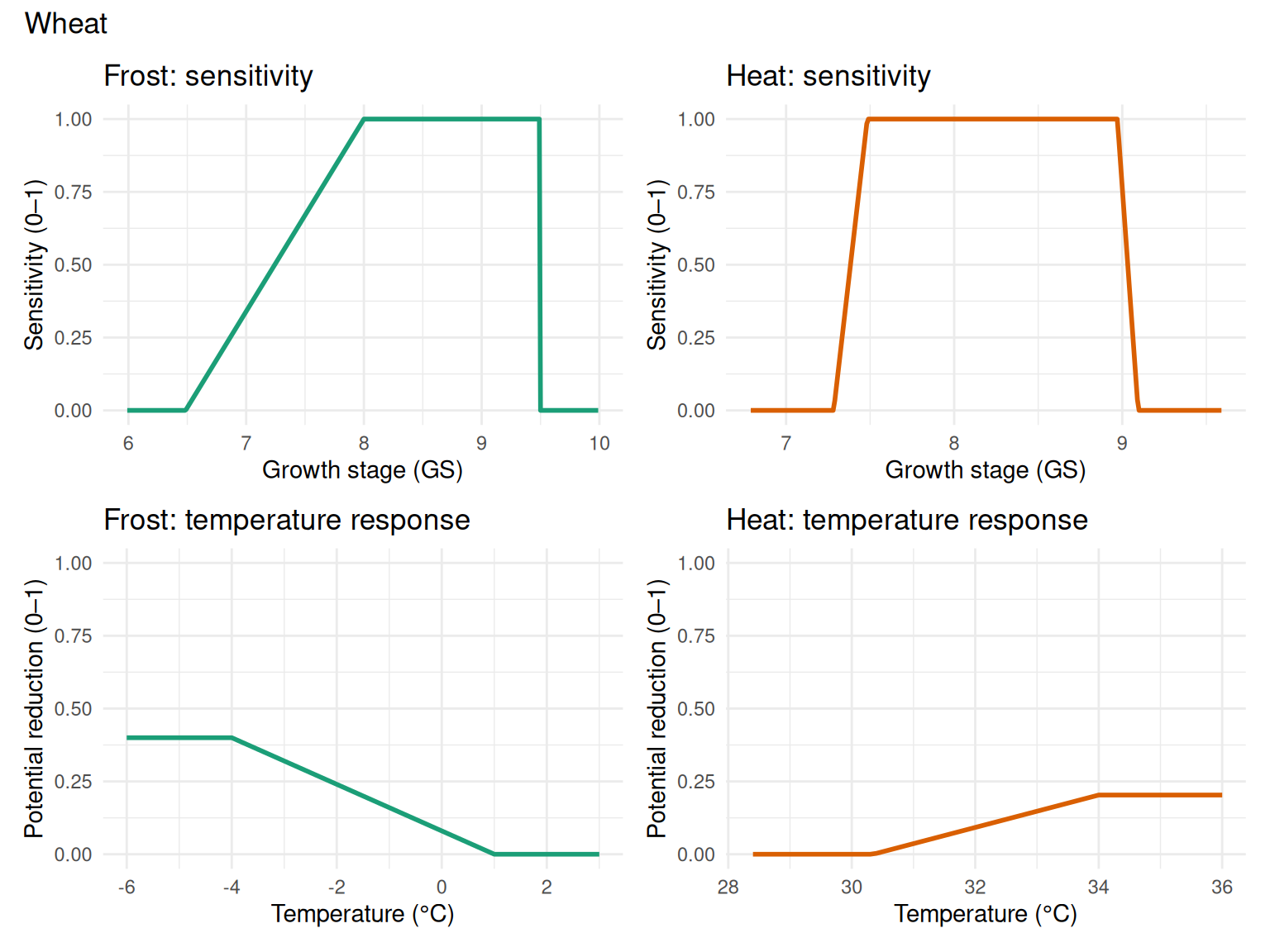 Parameter Interpretation: - Reduction ratio: 0 = no yield loss, 1 = complete yield loss - Sensitivity: 0 = no sensitivity (no damage regardless of temperature), 1 = maximum sensitivity (full potential damage occurs) - Growth stages (GS): Decimal scale tracking crop development (e.g., 8.0 ≈ anthesis for wheat)