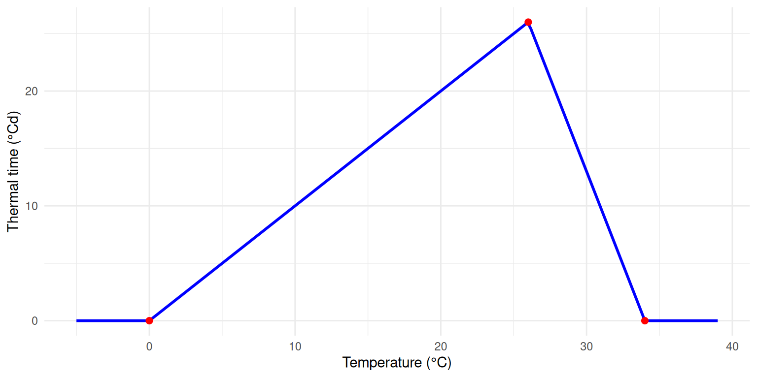 This configuration means: - For temperatures below 0°C, thermal time accumulation is 0 (development ceases) - From 0 to 26°C, thermal time increases linearly from 0 to 26°Cd per day - From 26 to 34°C, thermal time decreases linearly from 26 to 0°Cd per day - For temperatures above 34°C, thermal time accumulation is 0 (heat stress stops development)