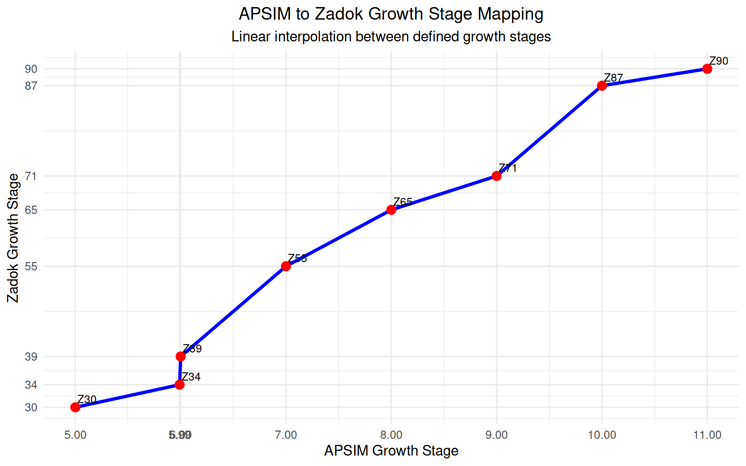 After the phenological stage reaches 5.3, Zadoks Stage (\(Z\)) is determined through linear interpolation between predefined growth stages and their corresponding Zadok values: