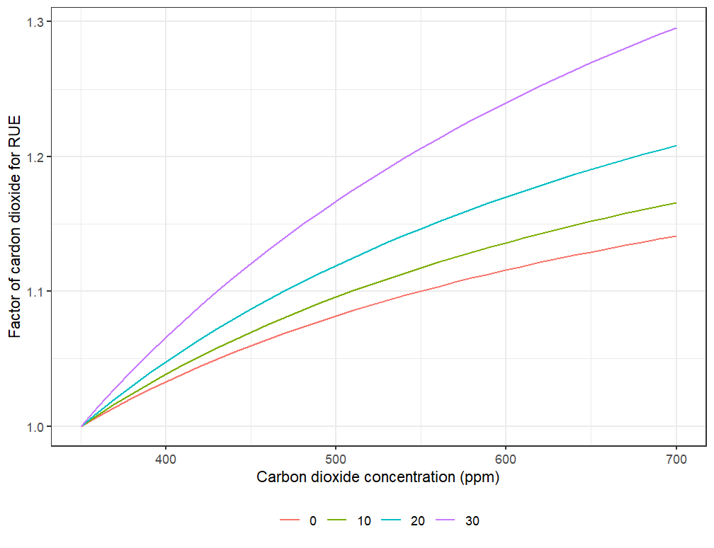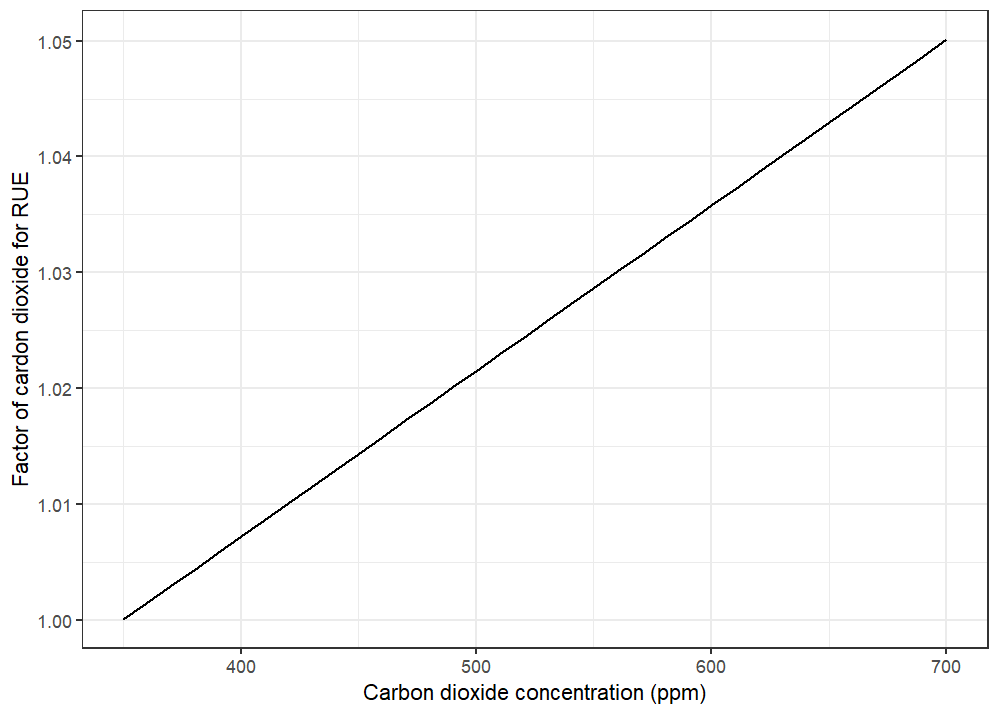 The APSIM model considers a reduction in Stomatal Conductance with increasing CO2 levels and its interaction with enhanced RUE|CO2 for RUE of C3. The Stomatal Conductance reduction is likely to reduce water loss but maintain photosynthesis due to higher water potential and internal CO2 levels, resulting in an increased transpiration efficiency (Reyenga et al. 1999). The response Stomatal Conductance of to increased CO2 concentration is calculated as follows (Elli et al. 2020).