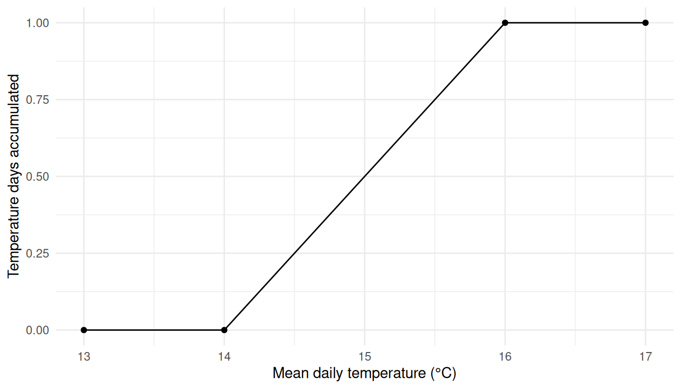\[ TD = \begin{cases} 0 & \text{if } T_{\text{mean}} < 14°C \\ \frac{T_{\text{mean}} - 14}{2} & \text{if } 14°C \leq T_{\text{mean}} < 16°C \\ 1 & \text{if } T_{\text{mean}} \geq 16°C \end{cases} \]