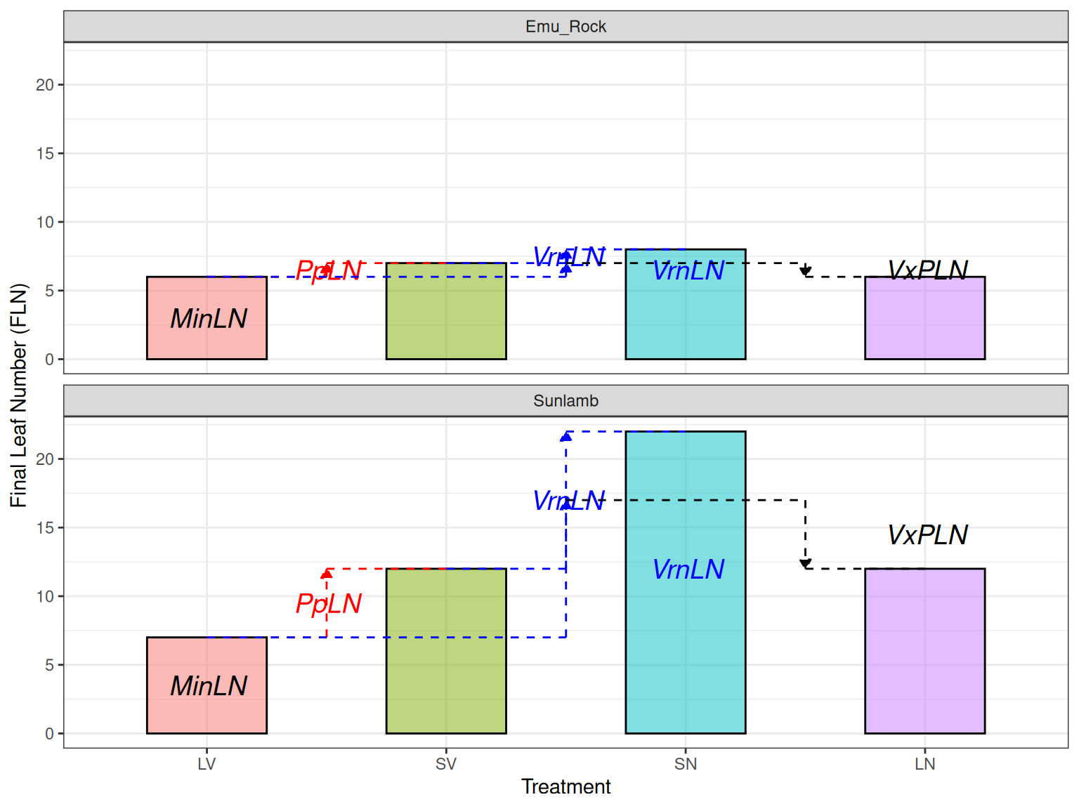 The final leaf number (FLN) for a genotype are observed or estimated under four controlled environmental conditions, which are the key driver of progress to the DoubleRidge stage.
