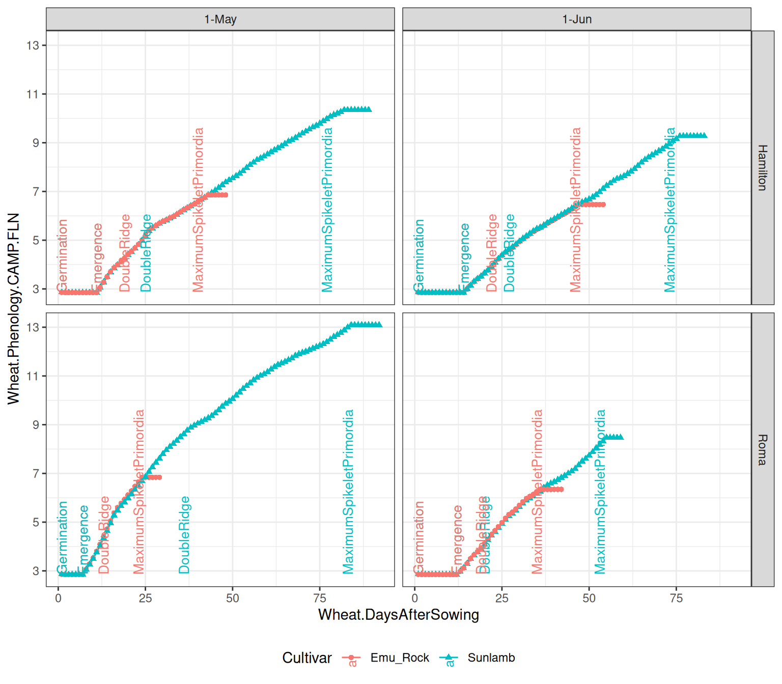 Two cultivars, Emu_Rock and Sunlamb, are used in the example simulations to represent the very quick and very late maturity types, respectively (Celestina et al. 2023). The following table shows the FLN parameters for these two cultivars: