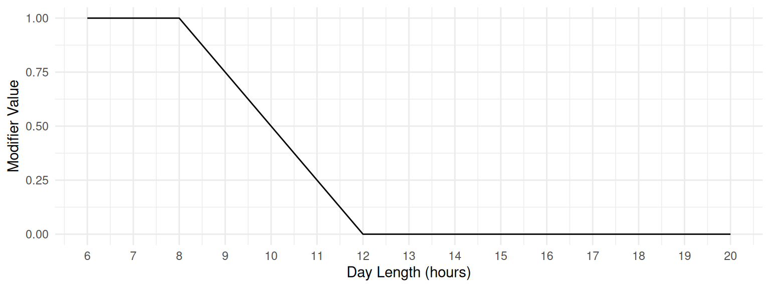 | Day Length (h) | Modifier \(f_d(d)\) |