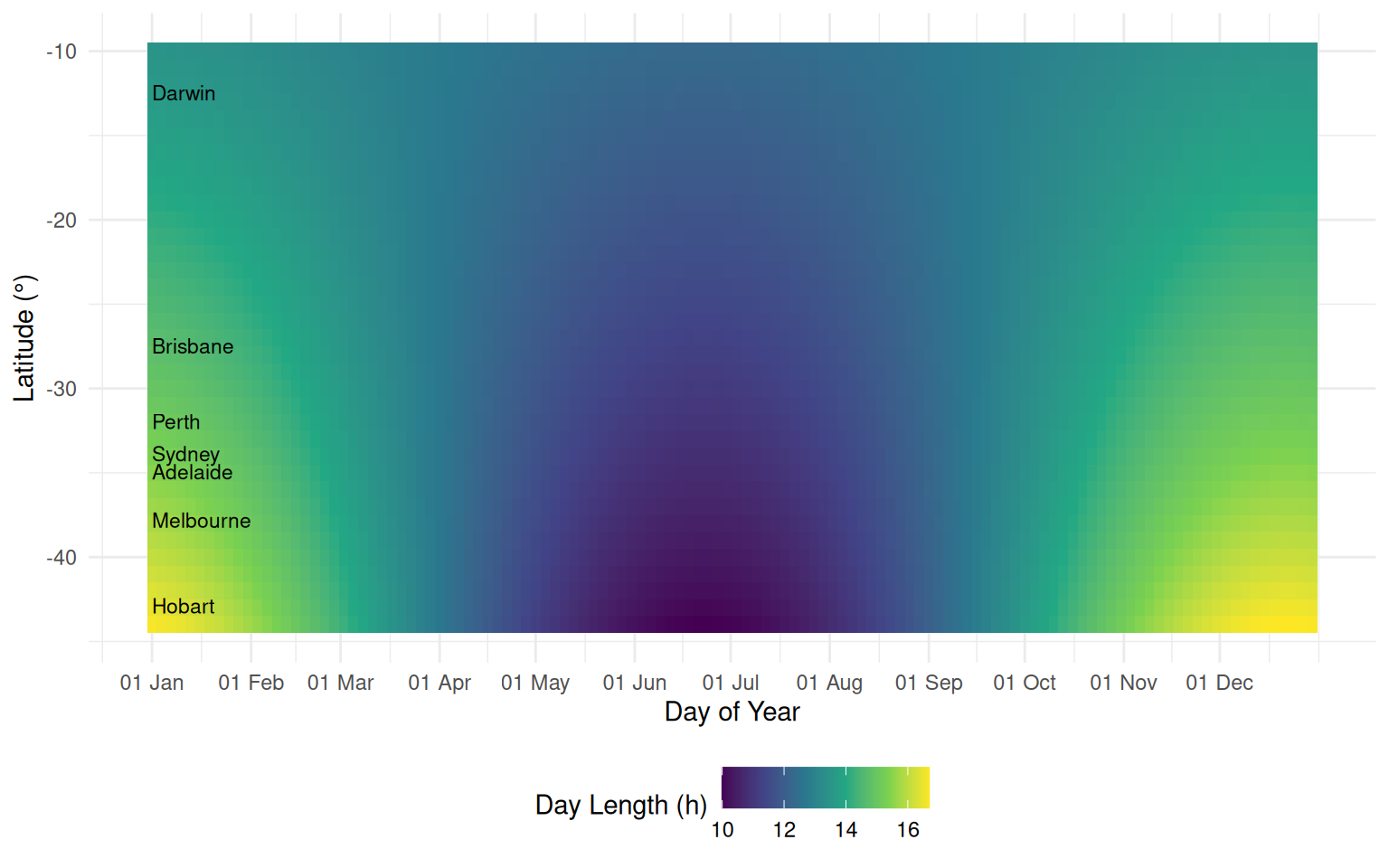 The day length varies from 9.9876135 to 16.7005717 hours across Australia, with the longest days occurring in summer (around December) and shortest in winter (around June).