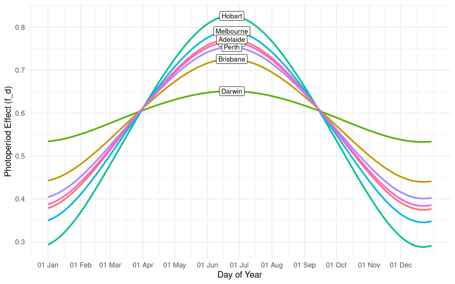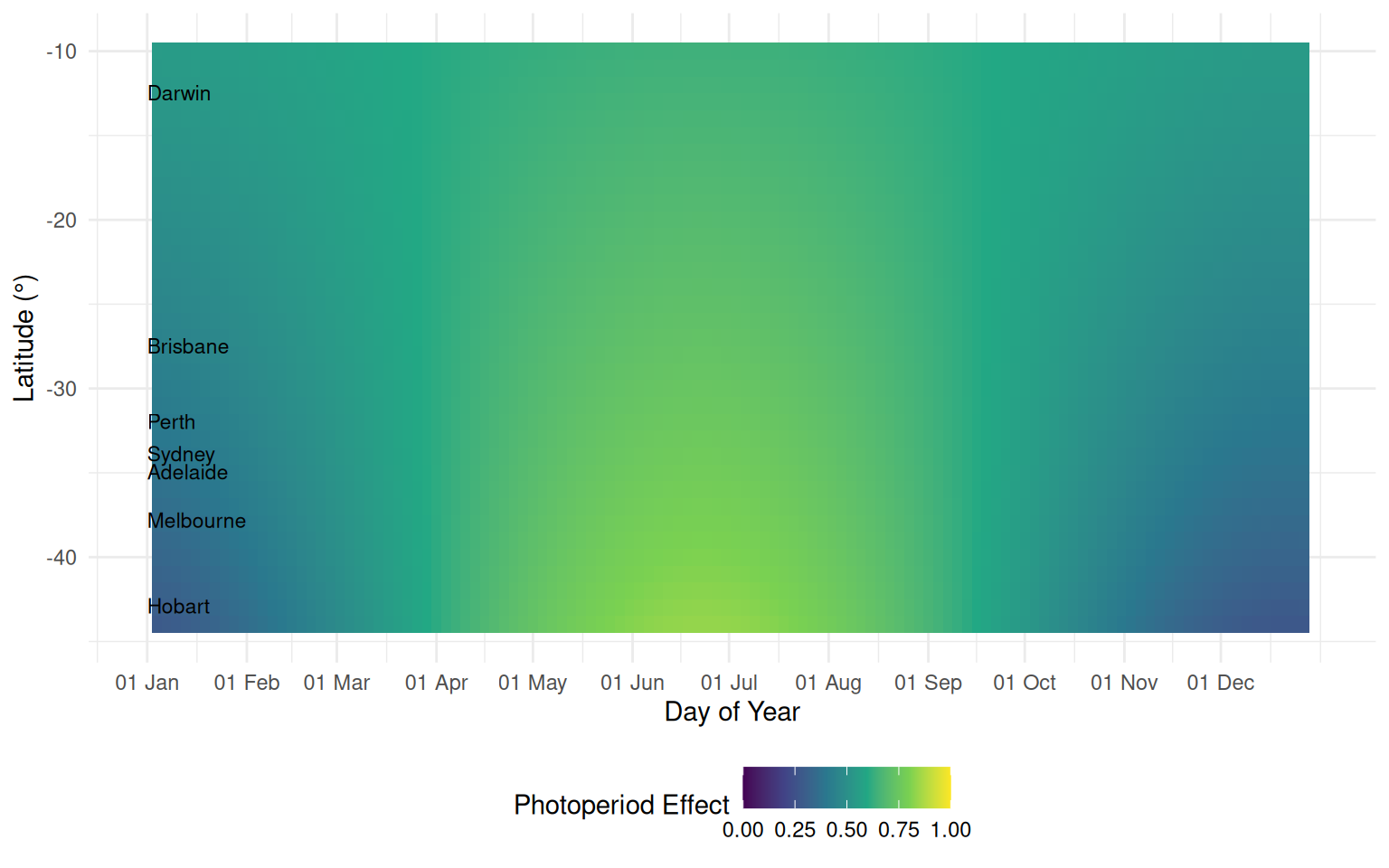 Photoperiod impacts on wheat heading phase in all capital cities from late April to late August which is the major wheat growing season before flag leaf stage in Australia.